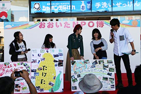 このイベントは大分市で活躍するNPOや学生団体が参加し日頃の活動を発表するもので、本学学生たちはサービスラーニングの活動についてステージやパネルで発表しました。