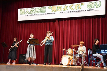 直入地区サークル活動の発表会みちょくれ祭りに本学JAZZサークルが参加してくれました。なかなか聞く事のないJAZZの演奏に地元の皆さんも興味深く聞き入っておりました。