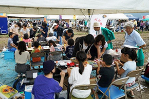 サービスラーニングで参加した学生達は、フォトフレームづくりのワークショップと赤い羽根ボールペンの募金活動を行いました。