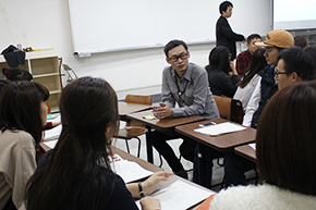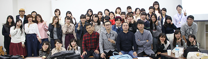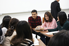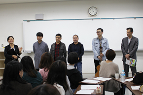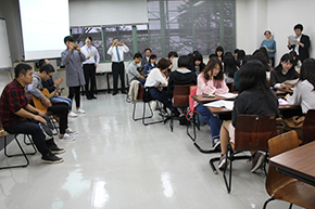 交流会は国際総合学科 許挺傑専任講師の司会のもと、「THE SWING BAND」メンバーのみなさんの自己紹介からはじまりました。つづいて本学学生も許専任講師の授業で習得した中国語で自己紹介。大分市役所国際推進室の崔さんの通訳を交え、交流会は和やかなムードでスタートしました。