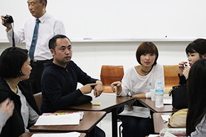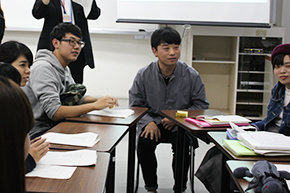 グループごとの意見交換会では、武漢市江漢大学からの留学生が通訳を務めてくれました。日本語や中国語を教えあったり、ときには英語を交えながら、各グループ活発に交流を図っていました。また、スマートフォンの動画サイトでおすすめの音楽の紹介をしたり、ブルースハープでジブリ映画の音楽を披露していただいたりと、笑い声がたえず、時間いっぱいに会話を楽しんでいる様子でした。