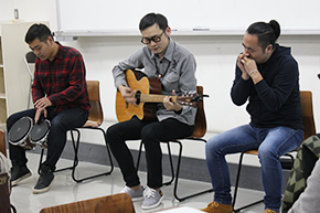 「THE SWING BAND」のみなさんに内モンゴルに伝わる音楽「ウランバートルの夜」、アメリカのポップス「Autumn Leaves」をアコースティックギターとブルースハープ、ボンゴで哀愁漂うブルース調の演奏を披露していただきました。