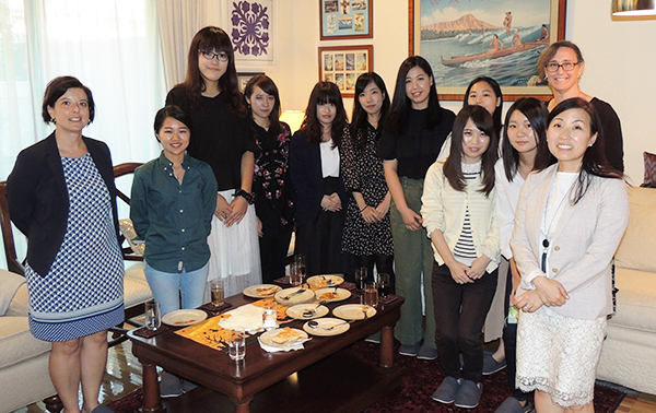 その後は、領事館敷地内にある首席領事の公宅に移り、首席領事のサクライ様やスタッフの方々と軽食をいただきながら交流や意見交換をしました。最後に集合写真を撮り、在福岡米国領事館の訪問を終了しました。