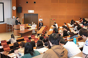 本学でも県選管の依頼を受け、11月7日(火)、「地域社会特講Ⅱ」の授業で、「選挙に行こう!~大学生も有権者だ~」と題して出前授業を行いました。講師は、県選管の高橋祐(ゆう)氏。受講生の7割程度は、すでに投票経験がありましたが、「10月の衆院選では、県内18歳の投票率は57%、19歳は25%とさらに低い」というデータを示され、学生たちも「これでは若者の声が政治に反映されない」という問題意識を抱いたようでした。