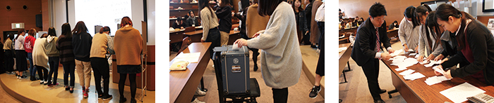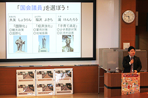 後半の体験学習「国会議員を選ぼう」では、実際の記載台と投票箱を使って模擬投票を行いました。「大友しょうりん」「福沢よきち」「瀧けんたろう」という架空の候補者3名の重点政策(公約)を高橋さんから説明。その後、学生全員が投票し、代表学生4名により開票作業を行いました。
