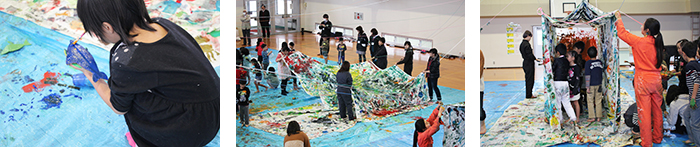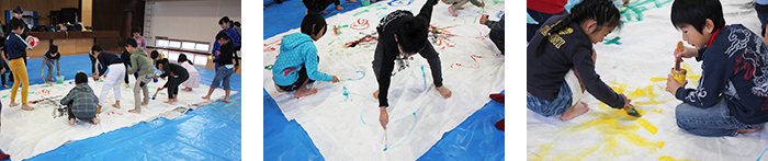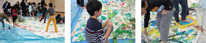 事前の準備では学生たちがたっぷりと絵の具を準備。大量の絵の具に「絵の具の海」を予感させます。2年生のみなさんをアーチでお迎えし、いよいよ「地域ふれあいアート講座」のスタートです!体育館の床に広げられた大きな布に、小学生達は飛び込むように絵の具を塗り始めました。最初は筆やハケを使っていましたが、いつの間にか道具を使わず手や足でペイント。布じゅうを駆け回り、あっというまに全身が絵の具だらけになりました。普段こんなに大きなキャンバスに絵を描くことはめったにないはず。はしゃぐのも無理がありません。