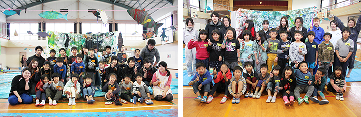 今回のテーマは「絵の具の海を魚と遊ぼう!」。本学美術科美術専攻1年生27名と、臼杵市立市浜小学校2年生のみなさんで3つのグループに分かれ、絵の具の海づくりを行いました。