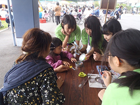 総合福祉施設美晴が丘の秋祭りにてidealサークルの学生11名が風車制作のワークショップを行いました。風車を片手に走り回る子ども達、なんとものどかな風景です。興味深く制作する大人たちの姿もありました。風車、単純ではありますが懐かしさを感じる素敵なおもちゃです。