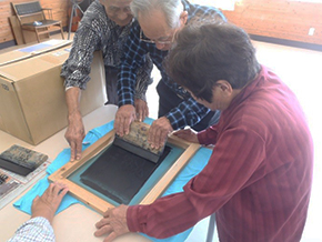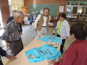 竹田キャンパスグラウンドにてゲートボールを行っている老人会(第3和楽会)のユニフォームTシャツを制作しました。みなさんでデザインを考え、シルクスクリーンの版はこちらで制作しましたが、プリントはおじいちゃん、おばあちゃん達に刷ってもらいました。自分達の使う物を自分達の手で作り上げる。それは、子ども達であろうと、おじいちゃん、おばあちゃんであろうと何とも素敵な事です。この日の竹田キャンパスは小さな工場になりました。