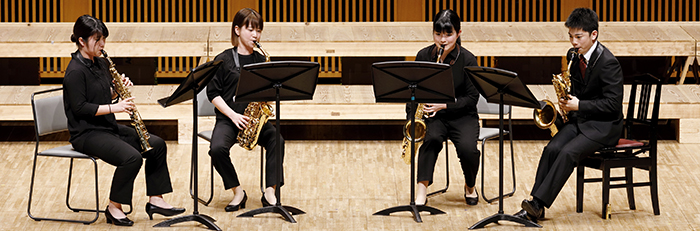 続いてプログラム2番サキソフォン四重奏「サキソフォン四重奏曲より第4楽章/サンジュレー作曲」、「陽炎の舞踏/八木澤教司作曲」。軽やかかつ四重奏とは思えない音の深みを楽しませてくれました。
