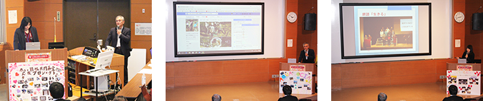 今回はサービスラーニング開始時から指導を担当し来年3月に退職される情報コミュニケーション学科吉良伸一教授の退職も記念しての開催となり、この日は卒業生の方々、企業・団体の方々にも聴講に訪れていただきました。中山学長は「芸文短大で皆さんの活動を見てきて元気をもらいました。実社会で自分の学習の成果を試すという活動を支えてこられた吉良先生に敬意を表します。」とあいさつし、満員の会場でにぎやかにフォーラムは開始しました。