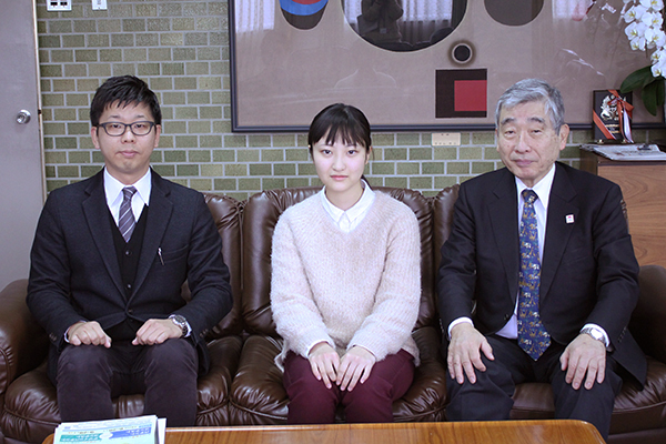 1月11日(木)には木下さんと野田専任講師が中山学長に受賞の報告をしました。報告の中で木下さんは、作品のアイディアを思いついた経緯や、過去の作品の調査が大変だったと話してくれました。