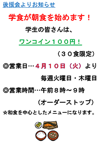 朝食を摂らない大学生が多いと言われる昨今、本学では学生の健康増進と生活習慣の見直しを目的に、学生食堂で朝食サービスを4月10日(火)から始めます。(一日30食限定)