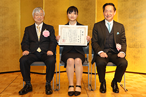 (写真左から:日本弁理士会デザインパテントコンテスト選考委員会副委員長 飯田 昭夫さん、木下さん、選考委員会委員長 毛利 衛さん(日本科学未来館 館長・宇宙飛行士))