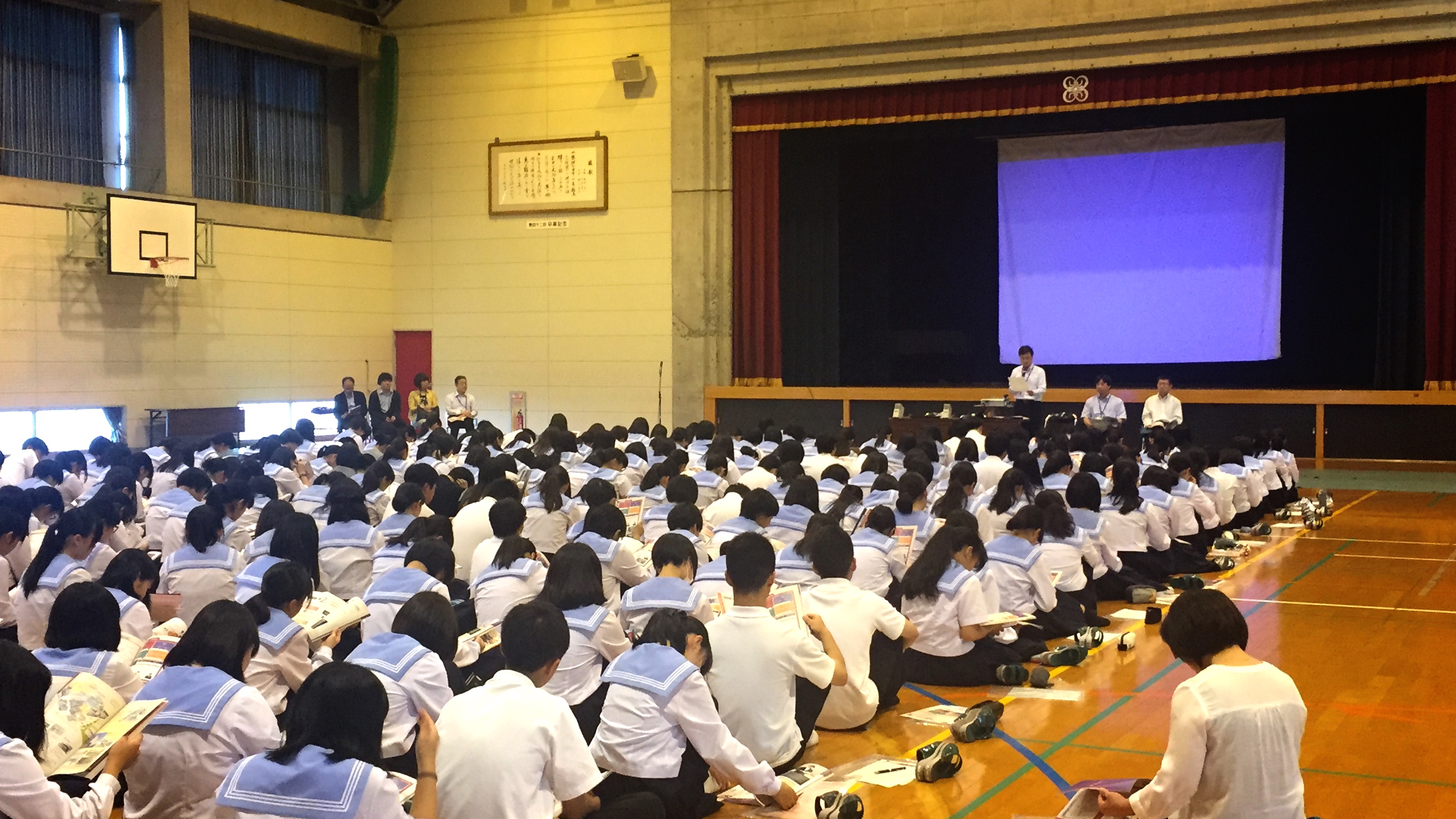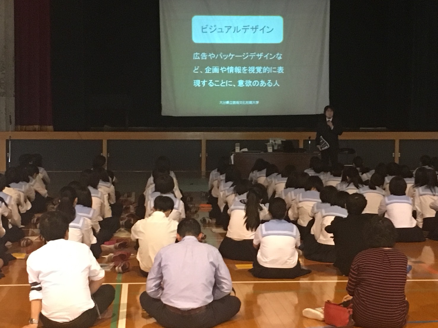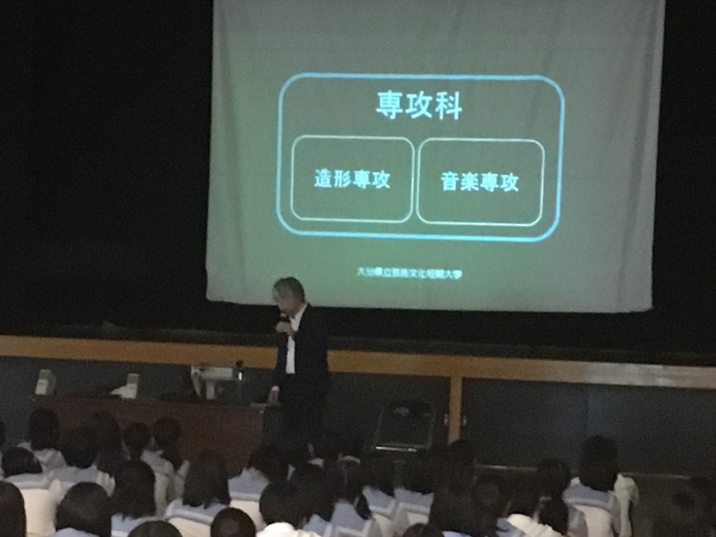 5月30日(水)、大分県立芸術緑丘高校で全校生徒を対象に、進学ガイダンスを開催しました。芸術緑丘高校で本学単独の進学ガイダンスを行うのは今回で2回目です。
