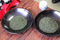 ご主人に、「蒸し茶」と「釜煎り茶」をいただきました。茶温は人肌に温めると美味しくなるそうです。飲みやすく美味しかったです。