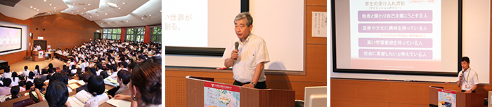 引き続き洲雅明教務学生部長から、本学の教育の特色・学生の受け入れ方針・卒業後の進路や学生生活について説明を行いました。