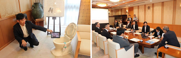 本学美術科デザイン専攻の松本康史准教授が、デザイン面での開発支援を行った「脊髄損傷者向け排泄支援装置(リハビリ機器)」の販売開始について、9月6日(木)、広瀬勝貞大分県知事に報告しました。
