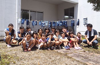 毎年恒例の直入子ども祭り。今回の染色講座は藍による絞り染めを行いました。みんな好き勝手に紐で布をグルグルグルグルと巻いていきます。そして染め終わり紐をほどいた時に「わぁー」と素敵なオリジナルの作品の出来上がり。不思議なもので、その子達の個性が表れてくるような模様に仕上がります。みんな目をキラキラしながらその模様を見つめる。いいですねぇ。