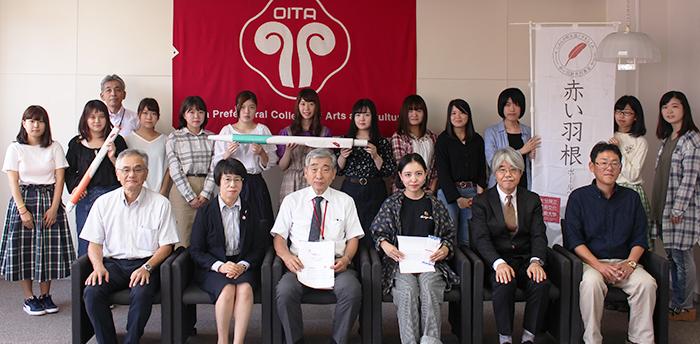 9月27日(木)、大分県共同募金会の方々にお越しいただき、本学でプロジェクトのキックオフセレモニーを行いました。中山学長の挨拶の後、大分県共同募金会の常務理事 吉田氏から「赤い羽根共同募金」の概要等についてお話いただき、今年のデザインを担当した美術科デザイン専攻プロダクトデザインコース2年の山中ももさんへ感謝の手紙もいただきました。