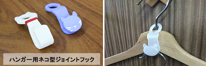 「ハンガー用ネコ型ジョイントフック」は、ハンガーとハンガーを連結して狭い収納スペースの縦空間を有効に活用できるものです。 無機質なデザインではなくネコをモチーフとしているので、気持ちにゆとりを持つことができます。 木下さんはコンテスト入選後も、美術科の松本康史准教授や地域のものづくり企業の方々にご協力いただき、 デザインのブラッシュアップと試作品の制作を進めてきました。
