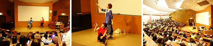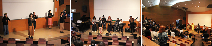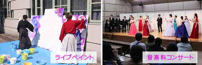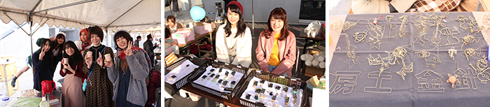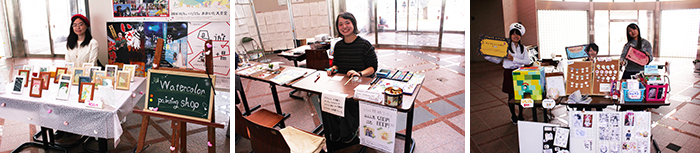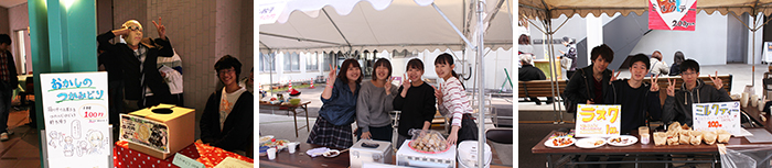 今年は新しくなった図書館と芸術デザイン棟前をメインに多彩な出店が登場しました。ステージ企画は人文棟の大講義室で行い、各サークルによる発表やスペシャルゲストによるライブなど、大いに盛り上がりました。学生手作りの雑貨や絵画の販売、音楽科有志によるコンサートなど、芸術系と人文系学科が共存する本学ならではの学園祭となりました。