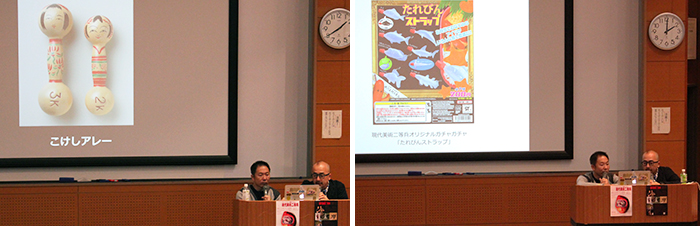 11月17日(土)、芸短フェスタの一環として「現代美術二等兵」の籠谷シェーン氏、ふじわらかつひと氏をお招きし、『たどり着いたらいつも駄美術』と題した講演会を本学大講義室において開催しました。「現代美術二等兵」とは、菓子の世界に駄菓子があるように、現代美術の中にも「駄美術」があっていいのではと芸術活動されているアートユニットです。