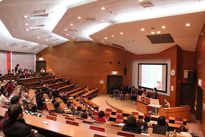 本学学生に加え一般参加の方も多数お集まりいただき、第1部ではお二人の自己紹介と、これまで制作した作品の紹介や制作の経緯などを写真や動画で紹介して頂きました。第2部では、大分合同新聞社の記者や美術科の学生らとのパネルディスカッションを行い、デザイン業界の年表を用いながら、現代美術二等兵の活動を分析していきました。