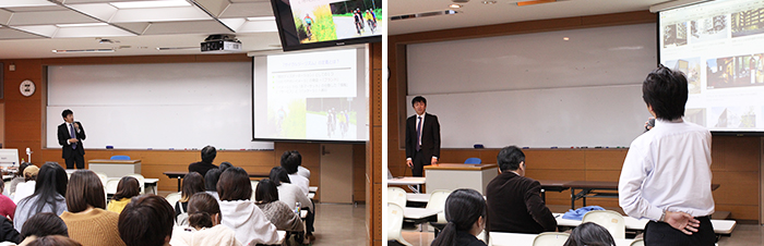 講演会では、これまでの高橋氏の経歴や現在関わっている事業の紹介とともに、事業コンセプトの考え方などプロジェクトを形づくる経緯(プロセス)について写真や動画を用いながらお話し頂きました。北海道や海外など、普段馴染みのない地名も多く、地理や地名についても時折解説を交えながら、サイクルツーリズムとは何か、事業デザインとはどういったことかをお話し頂きました。