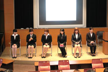 ガイダンスには、一般職・専門職・公務員の内定をもらった現2年生6名が参加、「どういう風に就職活動を行ったか」「内定企業を志望した理由」「試験対策」「エントリーシートや履歴書の書き方について」「面接を受けてみて重要だと感じたこと」など、これから就職活動を行う上で必要とされる項目について、インタビュー形式で報告してもらいました。