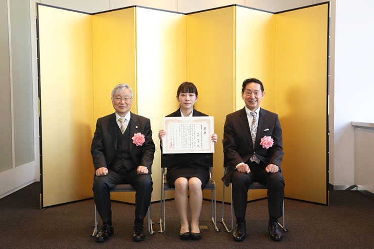 文部科学省や特許庁などが主催する「平成30年度デザインパテントコンテスト」において、美術科デザイン専攻2年生の岡部桃子さんの作品「変形する傘立て」が優秀賞に選出され、去る3月11日(月)に東京都で行われた表彰式に岡部さんとコンテストの指導にあたった情報コミュニケーション学科の野田 佳邦講師が出席しました。
