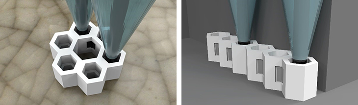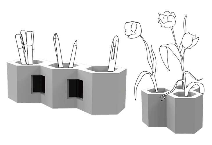 岡部さんの「変形する傘立て」は、六角柱の収納具を3つ連ね、可動部分を動かすことで変形できるようにし、スペースの形状を問わず傘立てを置けるようにしたものです。また、この傘立てを複数個並べて使うことで様々な幾何学模様を楽しむことができます。