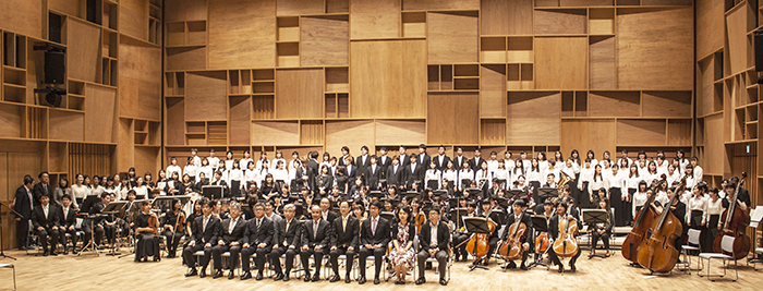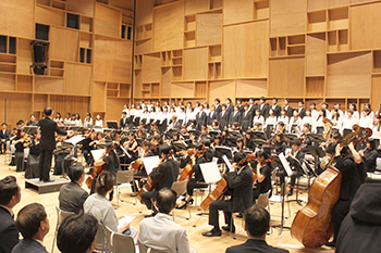 式後には、音楽ホールの披露コンサートとして、音楽科教員と学生、卒業生がオーケストラ演奏と大分県になじみ深い合唱を行い、新しいホールでの迫力ある演奏に会場は高揚感に包まれました。
