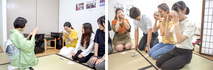 留学生の皆さんは慣れない正座に苦戦していましたが、「お手前頂戴いたします」と日本語で挨拶し、緊張しながらもお菓子とお抹茶を美味しそうにいただいていました。