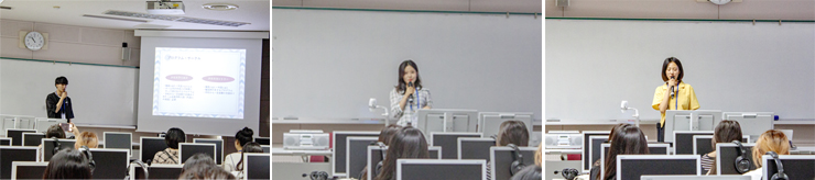 交流会では、培材大学の学生が、大学と近郊の大田(テジョン)の街並み紹介や、培材大学の魅力、外国人留学生と韓国の学生がお互いの国を理解しあうための支援プログラムなどをプレゼンテーションし、学生は興味深く聞き入っていました。