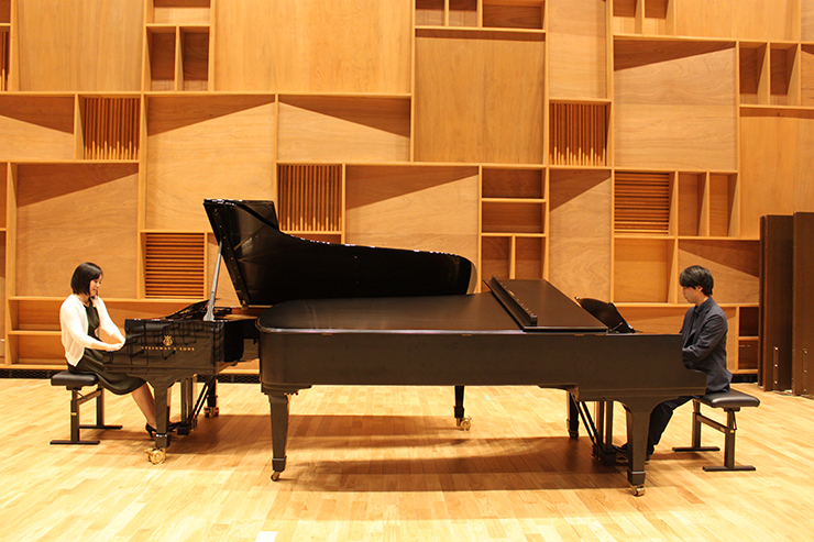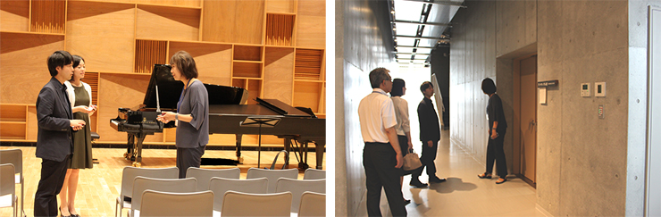 音楽ホール棟音楽ホールの内観を見学し、ピアノ二重奏を試し弾きいただき、「音の響きが良いですね」とお言葉をいただきました。