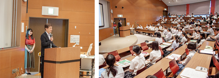 両日とも、大講義室をメイン会場に、3ケ所の講義室をサテライト会場に、在学生の司会進行のもと全体説明会を行い、本学理事より、大学の教育の特色・学生の受け入れ方針・卒業後の進路や学生生活について説明を行いました。