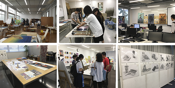 学生の作品展示や制作の様子を見ていただき、体験ワークショップも開催しました。