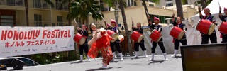 写真:琉球國祭り太鼓ハワイ支部と福島出身でハワイ大学留学中の学生による演舞「花は咲く」