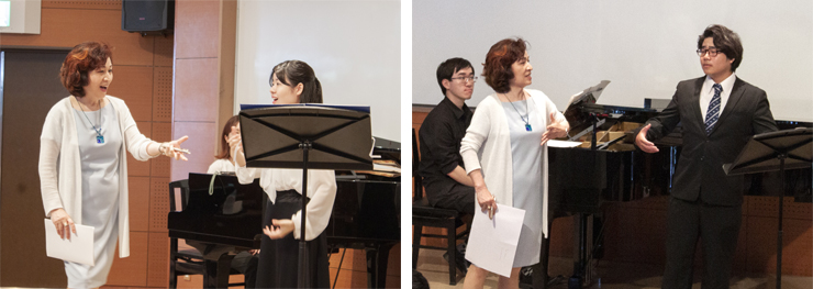 講義では、1節ごとの表現方法や発声イメージ、ブレスのタイミングなど細やかな指導をいただきました。またオペラ曲では、その内容や役の立ち回り、感情を意識した歌い方など、豊富な経験を学生にご教示くださいました。