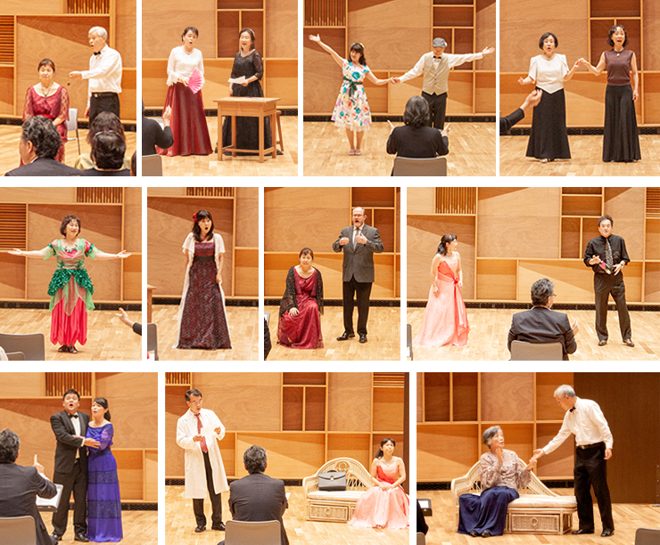 上級者コースではイタリア語のセリフを交えた曲もあり、受講生はホールに響き渡る歌声と、豊かな表情と演技を見せ、観客は曲を聴きながら舞台の情景を楽しんでいました。
