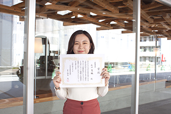 受賞した山口さんは本学卒業後に釜山外国語大学への編入学が決まっています。今回の受賞が編入学後の自信につながることを期待しています。