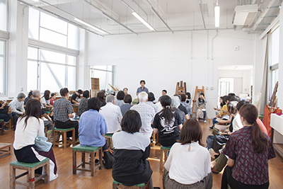 この講座は、油彩画や日本画などの絵画制作を通し、学生と一般の受講者が共に作品を制作する中で、その技法のみならず作品に取り組む姿勢など、様々な価値観の交流を目的に行い、10代から81歳までが受講しています。