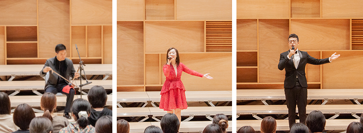 交流会では、まず武漢歌舞劇院に所属する励方明さん、程娜さん、諶宗燦さんが、独特の美しい音色や迫力ある歌声を披露し、学生たちもじっくりと聞き入りました。