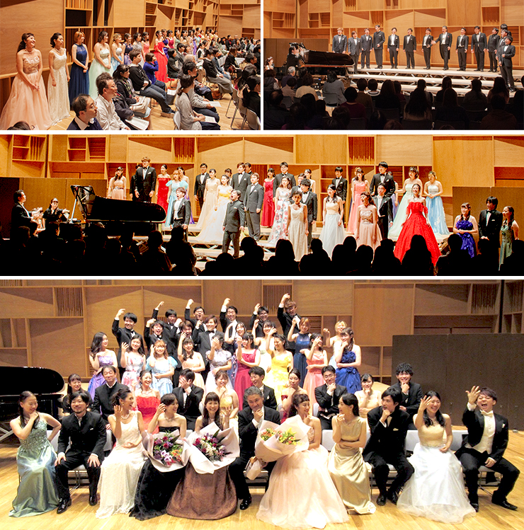 行天准教授と共に、師事する在学生、卒業生が出演し、ピアノ演奏と共にイタリアオペラ22曲の美しい歌声と情感あふれるシーンで観客を魅了し、来場者からは「ブラボー」の掛け声と拍手が贈られました。