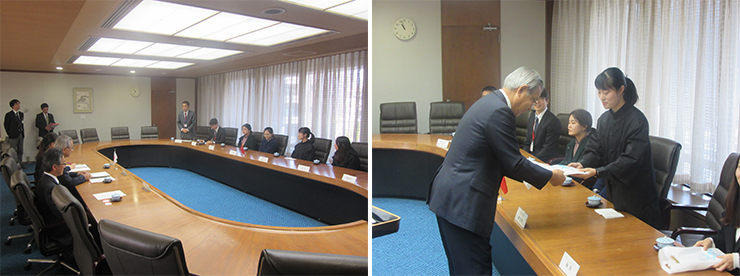 表敬に際して、国際総合学科の疇谷憲洋学科長から本学と江漢大学の交流事業の実績と現状を紹介し、久渡晃 副市長からは「日本語だけでなく、日本文化も勉強してもらい、将来は大分市と武漢市、さらに日中両国の架け橋になってもらいたい」とあいさつがありました。