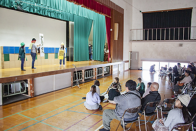 舞台は学生自ら脚本・作詞・美術演出等を企画し、児童らと演者、音響、美術に分かれ指導しました。2日間と短い期間でしたが、児童らは学生と一緒に楽しみながら舞台を作り上げ、笑いの絶えない空間の中で見事な演技と舞台演出を披露し、会場も盛り上がりました。