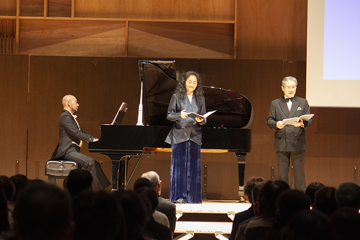 立ち見がでるほどの盛況の中コンサートはスタート。後藤氏のピアノに波多野睦美さんの優雅で力強いメゾソプラノと宮本名誉教授の深く豊かなバリトンがホール内に響き、観客を魅了しました。また、日本語訳の歌詞解説が歌と共にホールに映像として流れ、来場者は音楽と共にその情景を楽しみました。