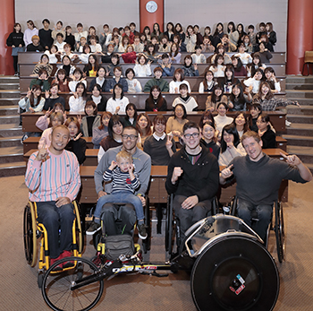 11月13日(水)、本学で「大分国際車いすマラソン大会 第8回交流イベント~外国人選手とTALK SHOW~」を開催しました。16日の第39回大分車いすマラソン大会を前に、国際総合学科の学生等126名が参加し、国際交流や障がい者スポーツなどに対する関心と知識の向上を図りました。