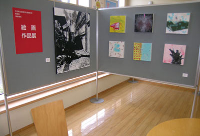 この作品展は、銀行ロビーの一角で開催しているもので、現在は本学美術科 美術専攻副手 稲垣由紀さんによる作品を展示しています。1ヶ月ずつ展示替えを行い、今後は在学生の作品を展示する予定です。